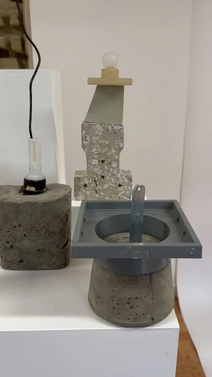Embracing the history within found materials, she combines constructed elements in cast concrete, paper pulp, silicon, plaster and metal.